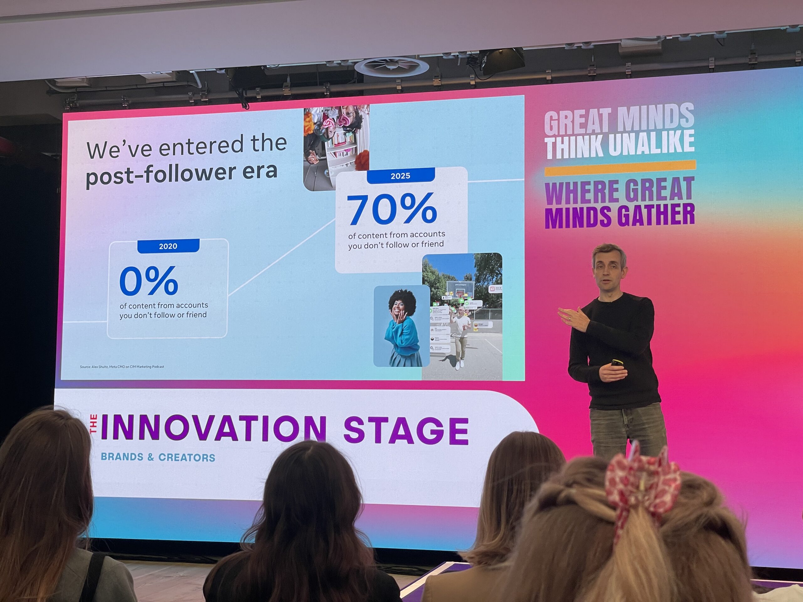 While sharing best practices for creator marketing on Meta platforms, Buckley (pictured below) acknowledged that 70% of the content viewed by Meta users last year came from accounts they did not follow. This is compared with 0% in 2020.