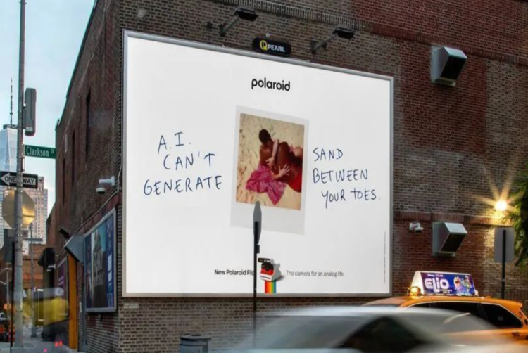 Polaroid placed bus stop ads near Apple and Google headquarters: “AI can’t generate sand between your toes.” It works because Polaroid’s entire brand is built on imperfection as a feature. Everything AI promises to fix, Polaroid celebrates as the point.