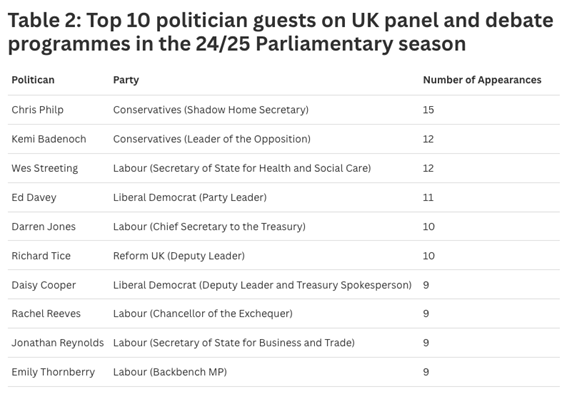 Breaking down appearances by politician, the study found that appearances by Labour politicians were split between a range of senior cabinet ministers, with prime minister Sir Keir Starmer only appearing in a handful of set-piece interviews.