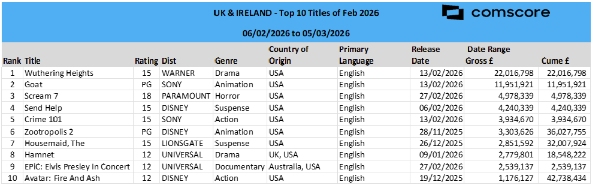 This was followed by Sam Raimi’s horror flick Send Help (£4.2m) and thriller Crime 101 (£3.9m). January holdovers Zootropolis 2 (£3.3m) and The Housemaid (£2.8m) also cracked February’s top 10.