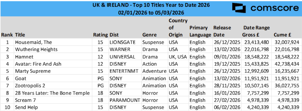 Linay commented that it was “nice to see mid-budget films doing okay”, adding that Lionsgate “smashed it” with The Housemaid, which is by far the top-grossing film of the year to date (£32m).