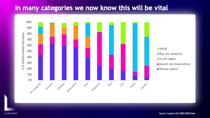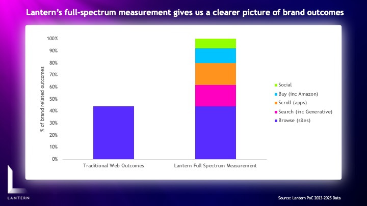 Lantern employs the use of a panel to access these insights. Ads rarely act in isolation; exposure may lead consumers to search, check social media, use generative AI, visit a website etc. Lantern tracks these behaviours and what particularly impressed me was the breadth of impacts that is trackable.