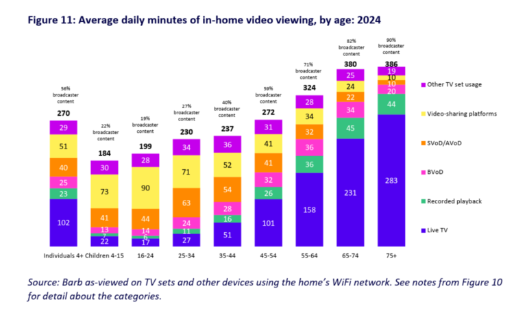 According to the OFCOM Media Nations report for 2025, 16-24-year-olds spend 90 minutes a day watching videos on platforms at home, accounting for 45% of their viewing.