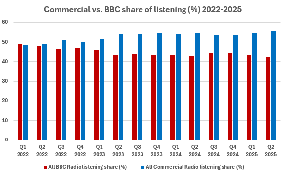 It now accounts for 55.7% of total listening, compared to the BBC’s 42.1%.