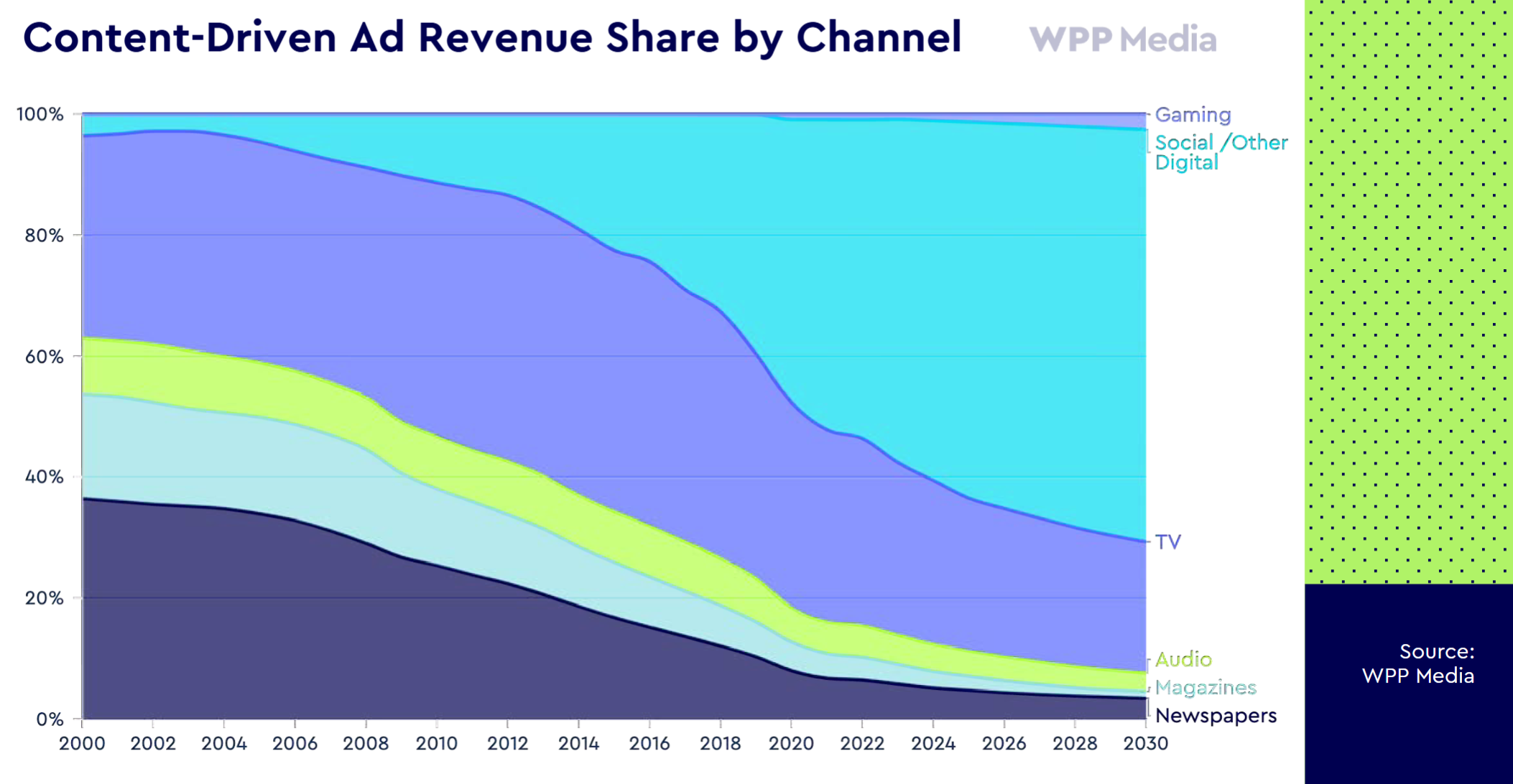 WPP defines “content-driven advertising” as inclusive of TV, audio, newspapers, magazines, social and gaming. The largest of any segment it measures, these channels are expected to account for 58% of total ad revenue in 2025.